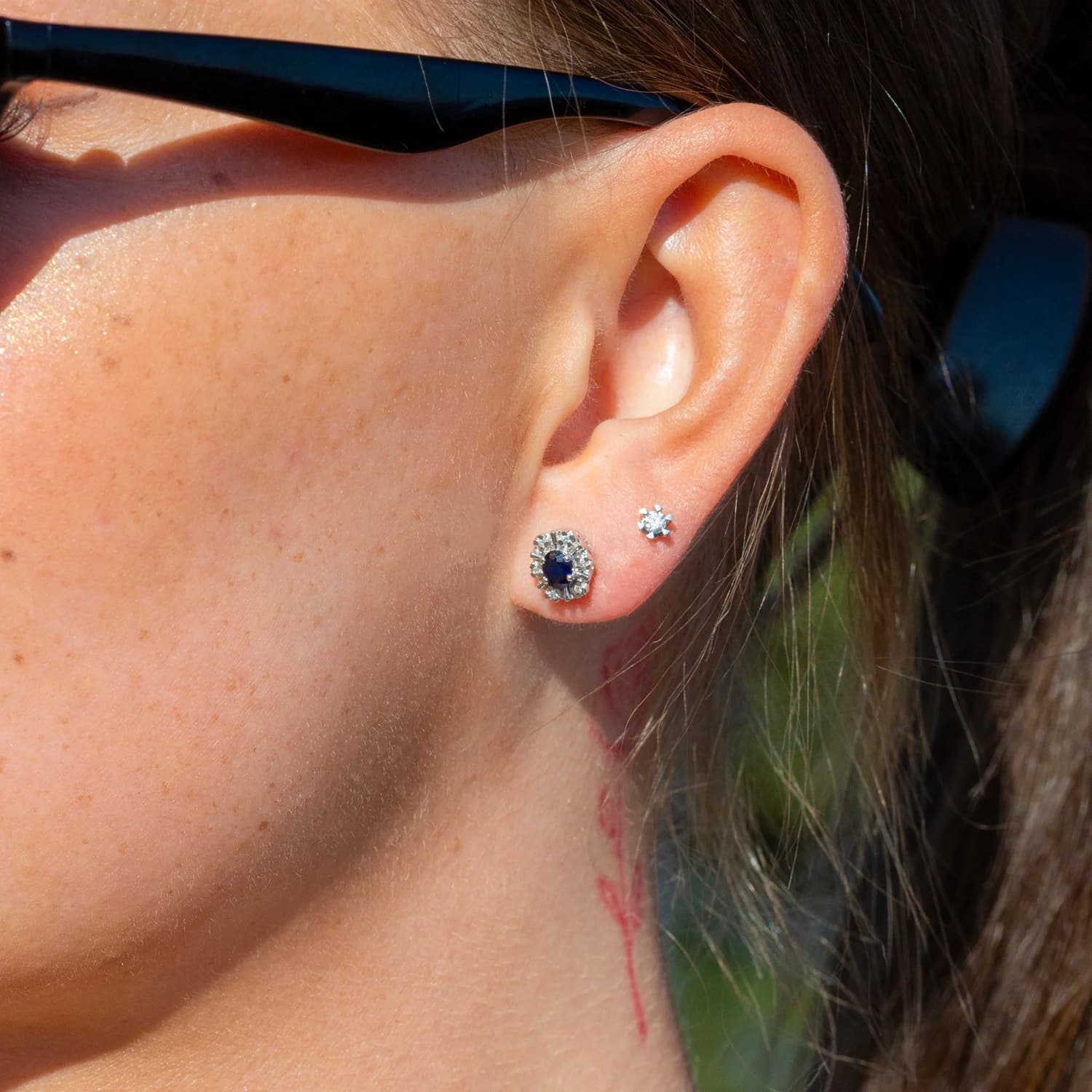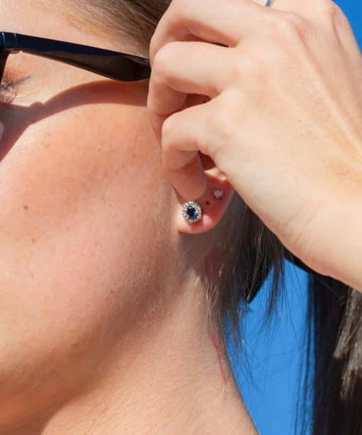 Dette flotte settet er satt sammen av hvitt gull, diamanter og blå safir på 4,4 x 3,5 mm. Det er en fin størrelse på dem som gjør dem like passende til hverdags som til fest. Det er en tidløs klassiker som aldri kommer til å gå av moten.