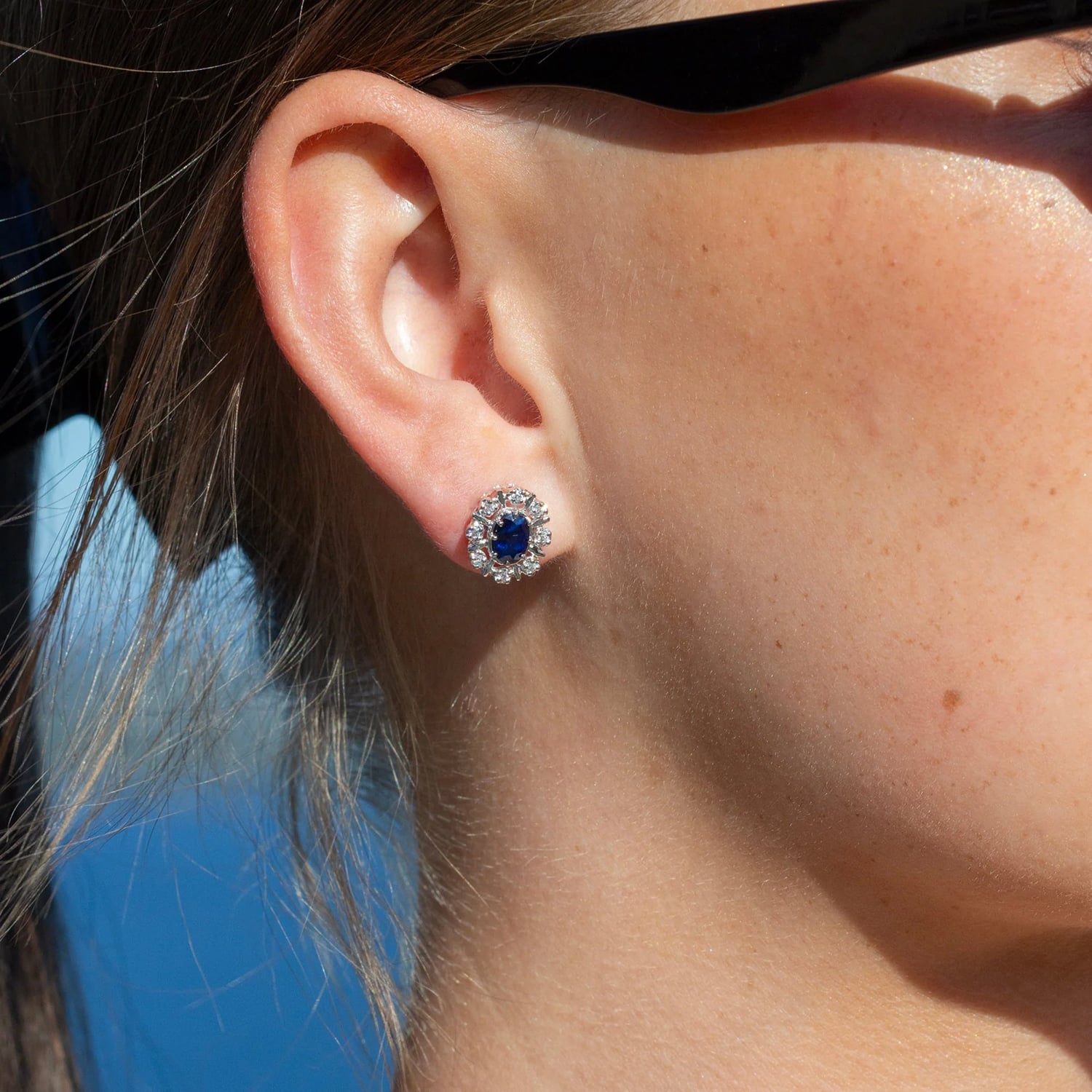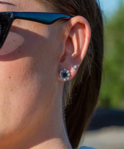 Eksklusiv diamantørepynt i 14 karat hvitt gull med ovale safirer og 0.16 ct TW/SI diamanter. Den dype blå fargen skaper en markant kontrast til diamantene og metallet, uansett valg av gullfarge. Det stjernepregede designet gir ørepynten et unikt, luksuriøst særpreg med sterk tilstedeværelse.