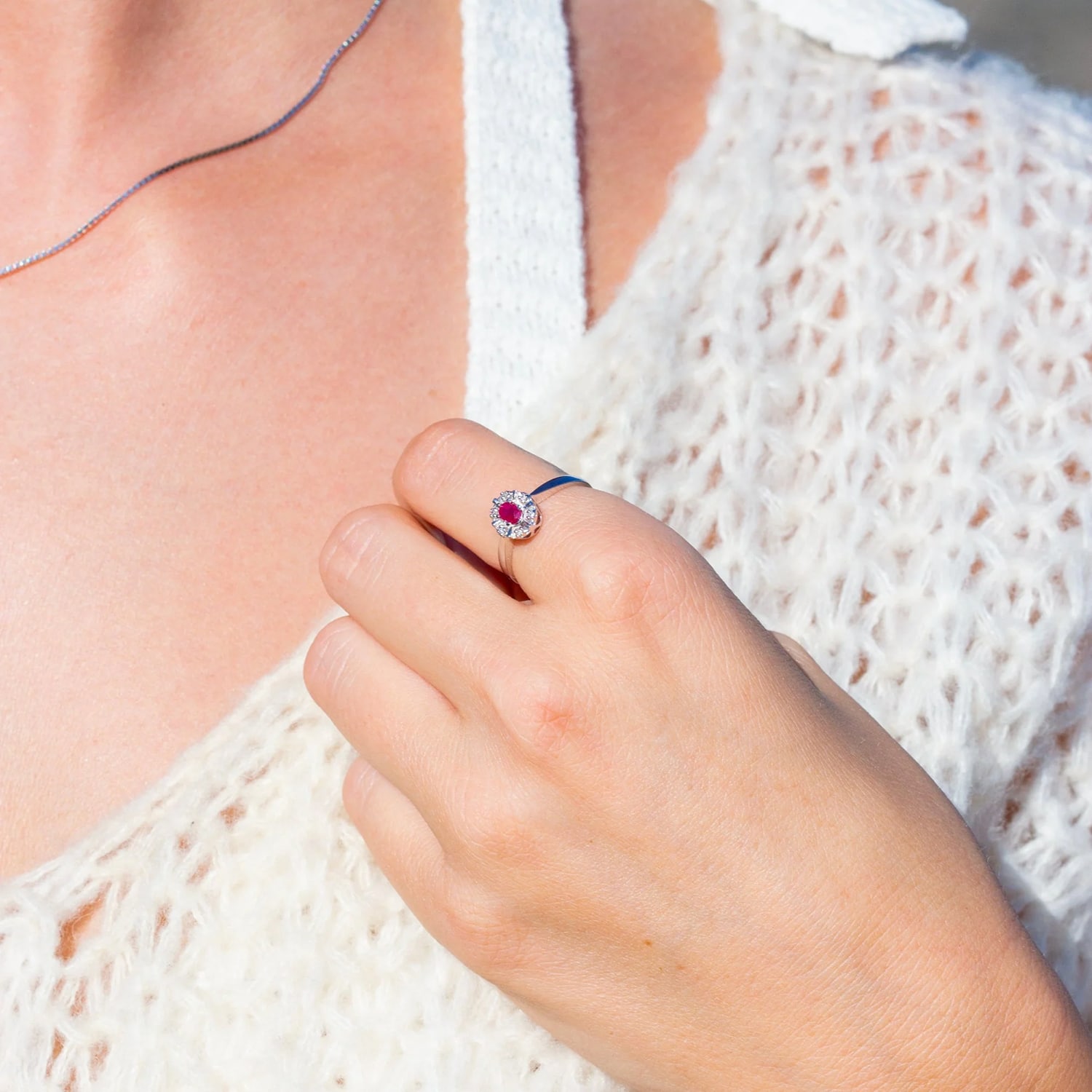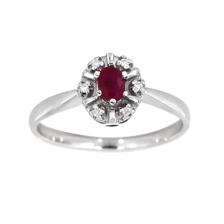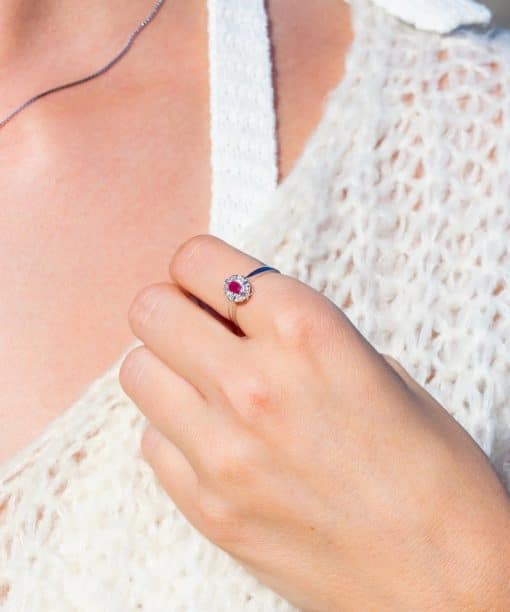 Elegant ring i 14 karat hvitt gull med en strålende rubin som midtpunkt, vakkert omkranset av 0,03 ct briljantslipte diamanter. Den intense røde fargen skaper et iøynefallende og sofistikert uttrykk, mens den delikate utformingen gir ringen et lett og elegant preg. Et smykke som kombinerer tidløs skjønnhet med eksklusivt design.