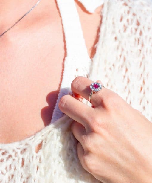 Eksklusiv ring i 14 karat hvitt gull med en levende rubin som midtpunkt, vakkert innrammet av 0,08 ct briljantslipte diamanter. Rubinens intense røde fargetone gir ringen et iøynefallende preg, mens diamantene tilfører en tidløs og glitrende eleganse. Et smykke som både markerer spesielle øyeblikk og gir hverdagen et løft av luksus.
