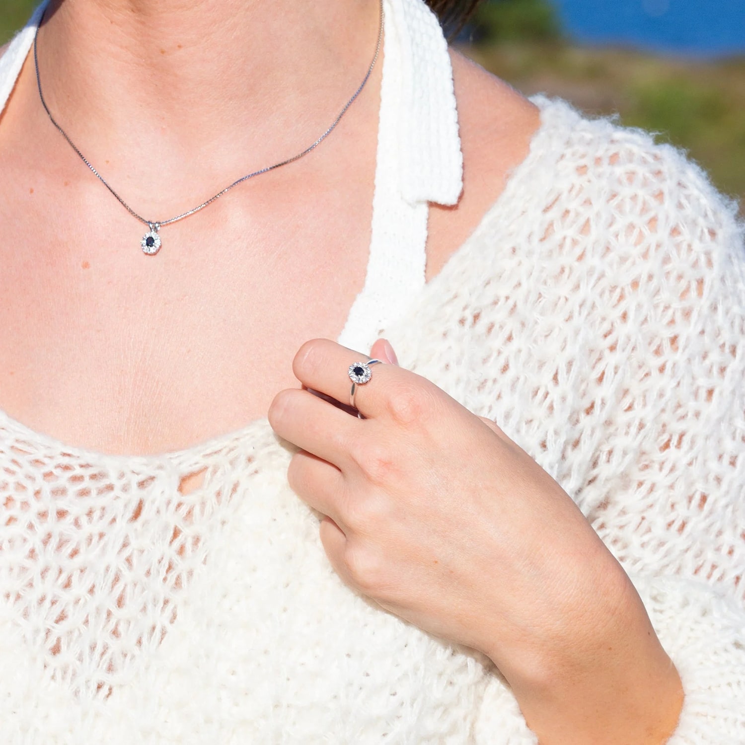 Elegant ring i 14 karat hvitt gull med en dypblå safir som midtpunkt, vakkert omkranset av 0,03 ct briljantslipte diamanter. Den rike blå fargen gir ringen et klassisk og eksklusivt uttrykk, mens den fine utformingen tilfører en lett og raffinert eleganse. Et tidløst smykke som passer perfekt til både hverdag og fest.