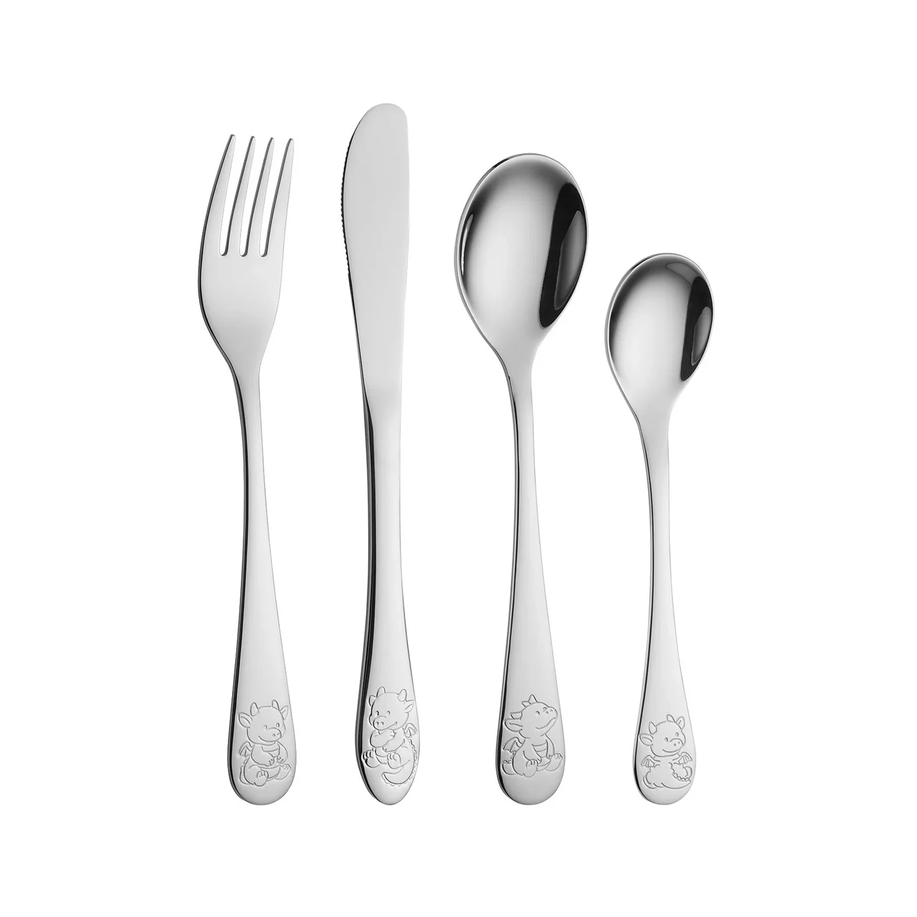 Stålbestikk i fire deler. Leveres i flott gaveeske sammen med en dragebamse.