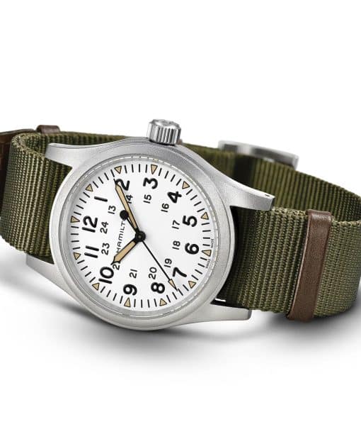 38 mm matt, rustfri stålkasse, tre visere, hvit tallskive, trekantede Super-LumiNova® indekser med gammel radiumfarge, slitesterk NATO-reim: Den nye Khaki Field Mechanical er en ekte gjenskapelse av forgjengeren fra 1960-tallet og trofast mot Hamiltons militære arv. Inspirert av militæret og bygget for å vare – dette er den originale soldatklokken.