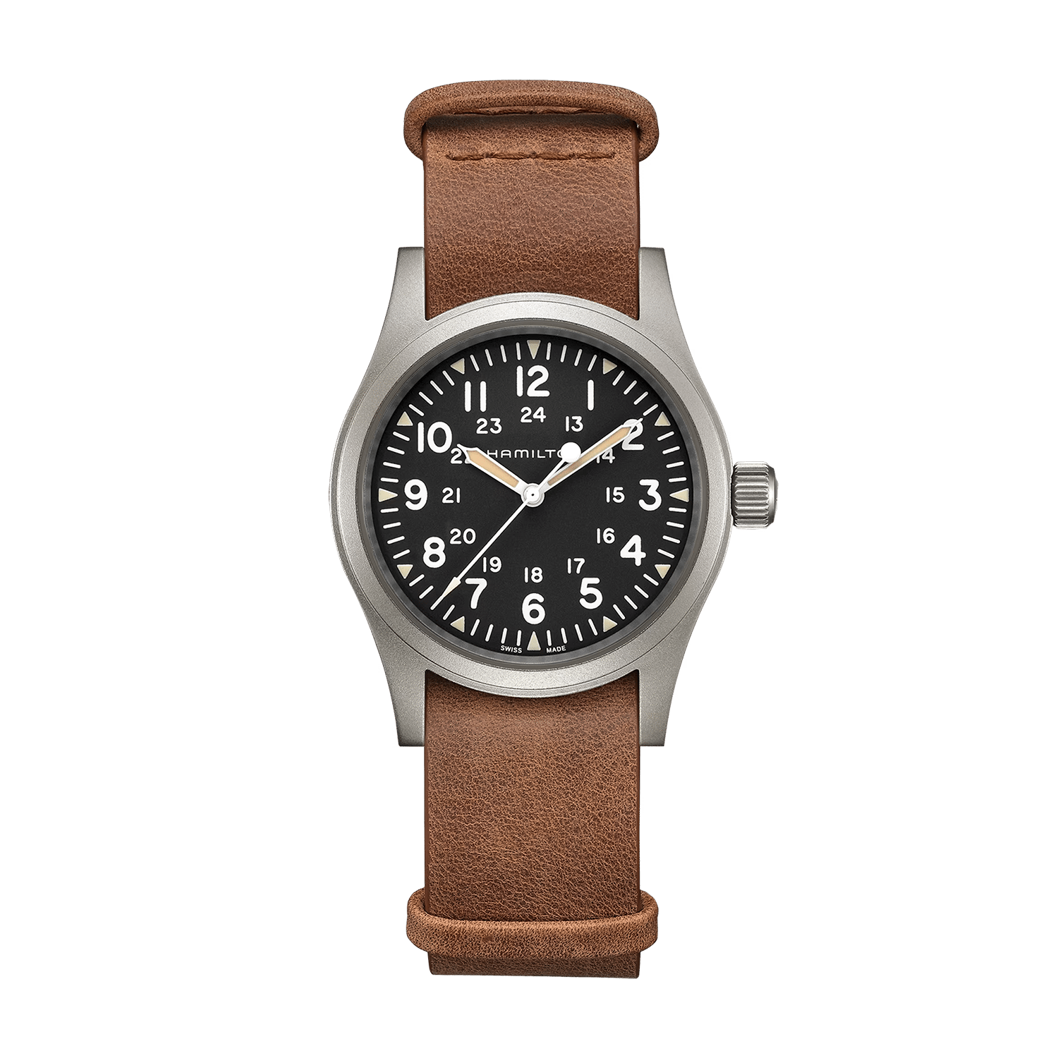 38 mm kasse i rustfitt stål, tre visere, mørk tallskive med lyse tall, trekantede Super-LumiNova® indekser med gammel radiumfarge, slitesterk NATO-reim: Den nye Khaki Field Mechanical er en ekte gjenskapelse av forgjengeren fra 1960-tallet og er trofast mot Hamiltons militære arv. Den originale soldatklokken kommer nå i kasse med Hamiltons unike ‘Earth’-fargede PVD-belegg. Skinnremmer fra Hamilton er laget av naturlige materialer og er garvet, men har ikke blitt behandlet, pigmentert eller ferdigstilt på samme måte som andre skinnremmer. Dette fører til at remmen beholder sitt naturlige utseende, noe som betyr at hver reim forskjellig. Fargen på skinnremmen kan dermed avvike fra fargen på bildet.