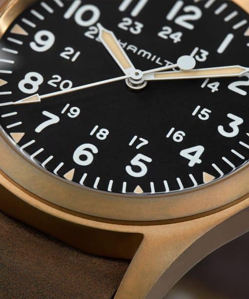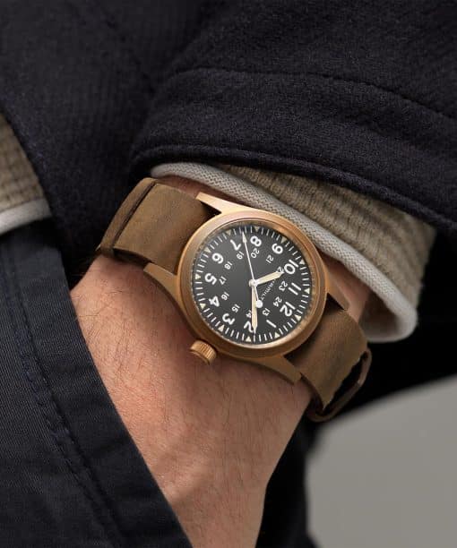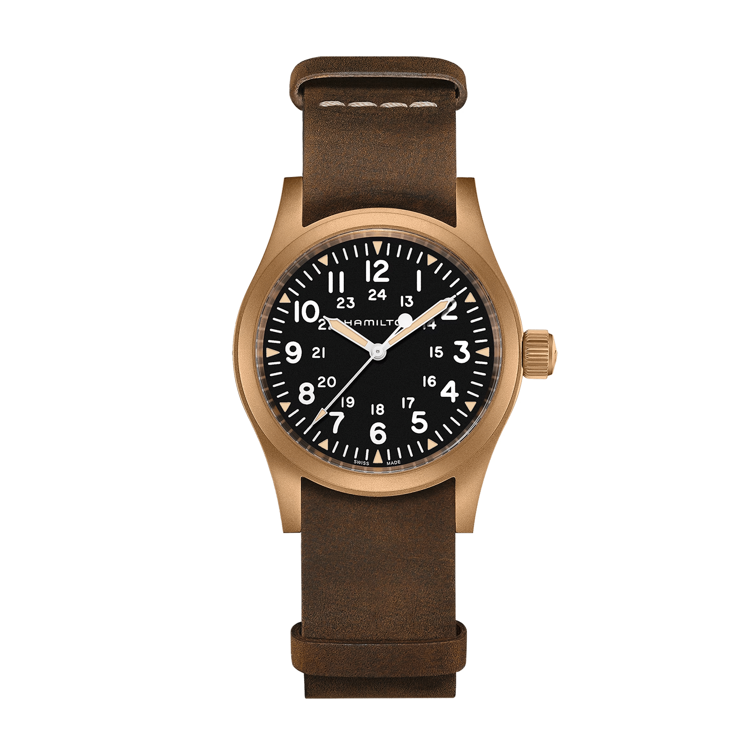 Hamilton gir den klassiske soldatklokken en unik vri med sin første bronsekasse noensinne. Khaki Field Mechanical Bronze skaper sin egen historie gjennom hver bruk, da kassen gradvis utvikler en unik patina. Klokken er drevet av det eksklusive, manuelle H-50 urverket, baklokk i titan og en myk, brun skinnreim i NATO-stil. Denne 38mm favoritten hyller Hamiltons stolte militærarv samtidig som den ser fremover. Hver feltklokke vil få en unik historie – hvilken blir din? *Bronsekassen får en individuell patina basert på hvordan den blir eksponert for omgivelsene, og denne naturlige aldringsprosessen gir klokken et særegent utseende. Bruk en mikrofiberklut for å rengjøre klokken forsiktig..