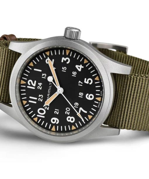 En av Hamiltons mest ikoniske klokker er nå tilgjengelig med en større kassestørrelse. Med en sandblåst kasse i rustflitt stål, svært lesbar urskive i hvit eller svart og drevet av det eksklusive, manuelle H-50 urverket – Khaki Field Mechanical 42mm er trofast mot originalen. Enten du bruker denne oppdaterte versjonen av den originale soldatklokken med en behagelig lenke i rustfritt stål eller en grønn NATO-reim i tekstil, vil det robuste og slitesterke designet sørge for at du er punktlig på hvert eventyr.