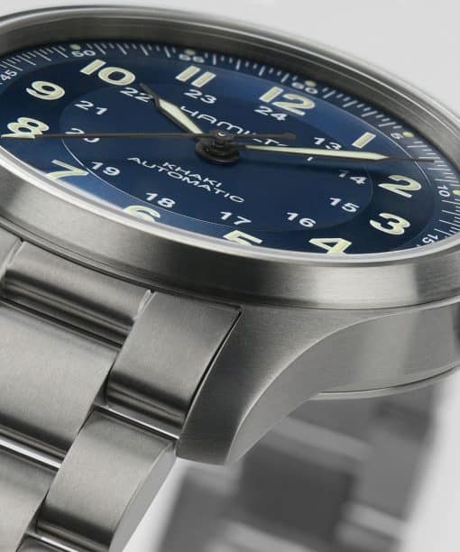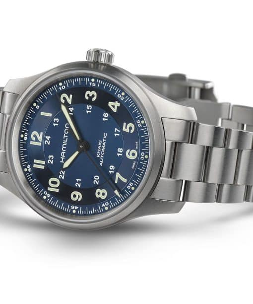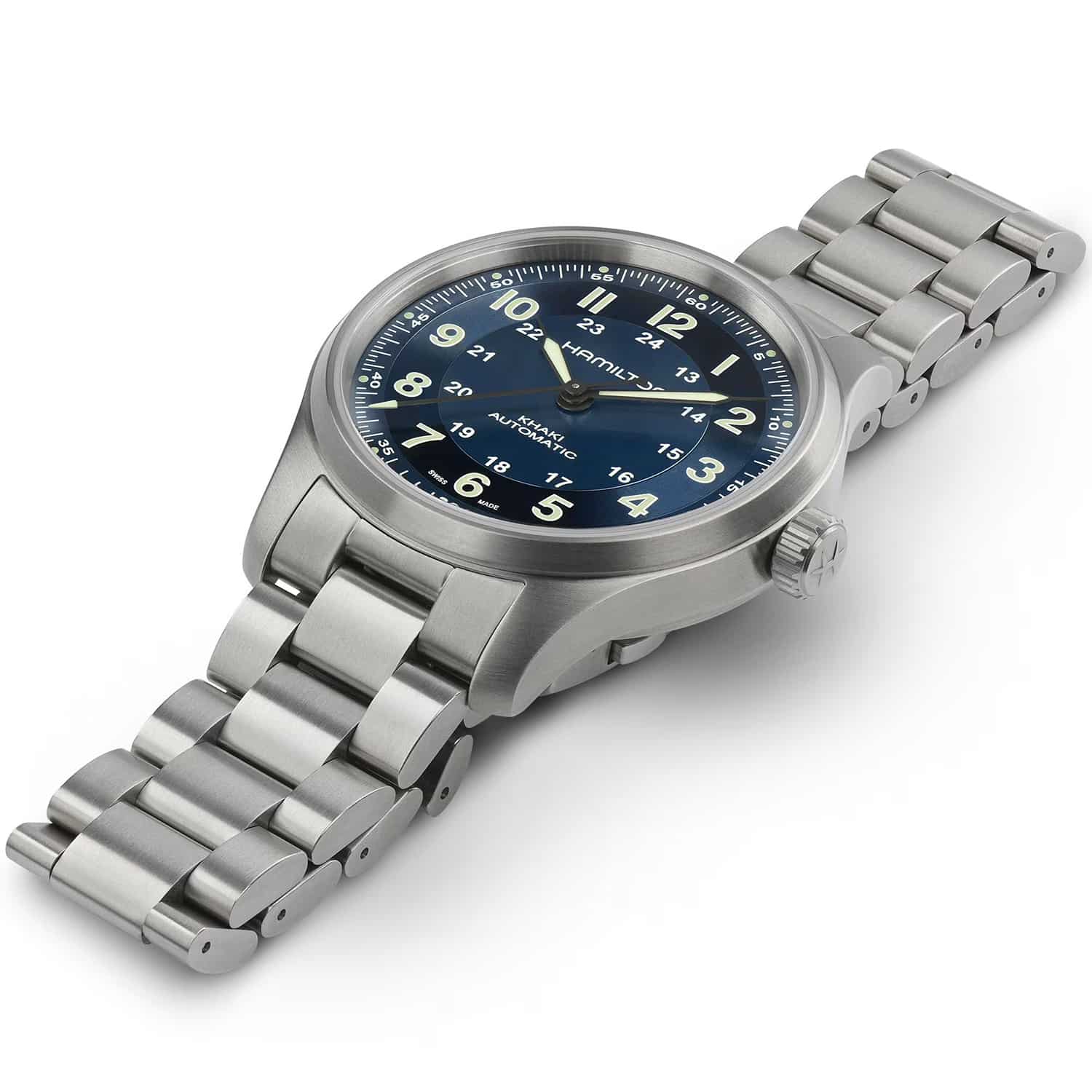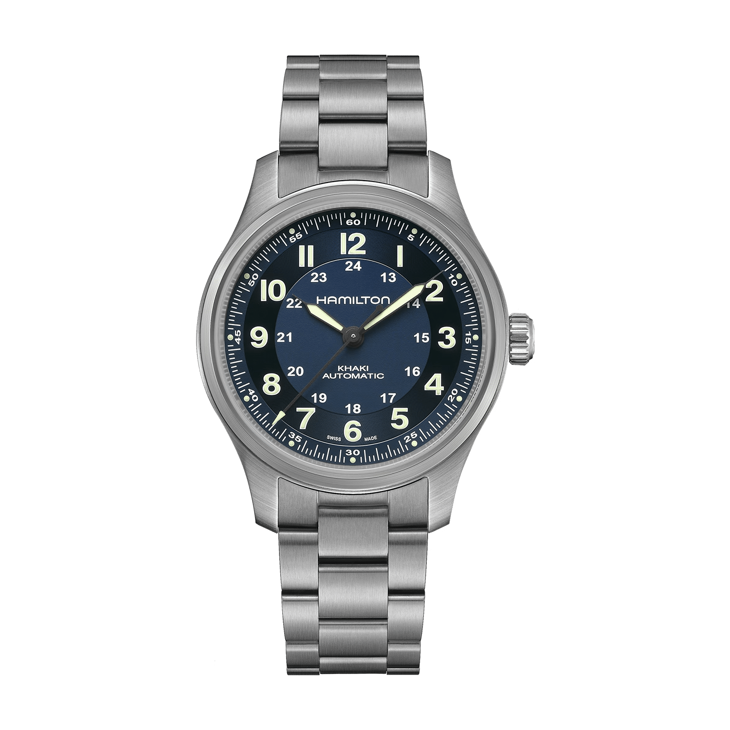 Med en kasse og lenke i titan er 42mm Khaki Field Titanium en svært allsidig klokke som kan brukes ved enhver anledning. Den blå urskiven har utmerket lesbarhet og holder deg på rett spor på alle eventyr. Lenken har en børstet finish som gir det militære designet et robust og karakteristisk preg. Ved å kombinere lett funksjonalitet med militær stil, er Khaki Field Titanium din pålitelige følgesvenn i jakten på nye opplevelser.