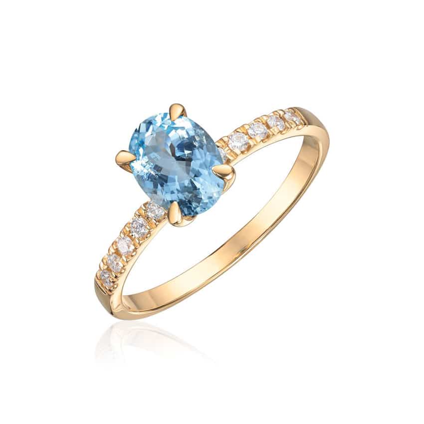 Ring Olivia i gult gull med 0,12ct WSI og akvamarin oval midtstein