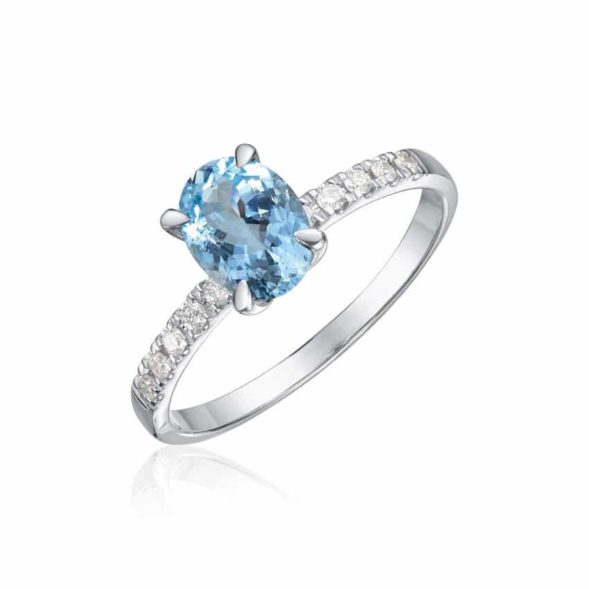Ring Olivia i hvitt gull med 0,12ct WSI og akvamarin oval midtstein