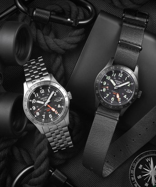 The Seiko 5 Sports Field collection was created with an ‘in the field’ military design –taking inspiration from a style originally called a ‘trench watch,’ created to be robust and reliable in tough conditions –echoing the Seiko 5 Sports characteristics. This Seiko 5 Sports ‘Deception’ field watch with its black dial and bezel takes the design to the next level, with a GMT function that allows you to track a second time zone. The black-coloured bezel features a 24-hour indication and a large, orange GMT hand for legibility. The base design and size remains the same as the original field watches, ensuring that the design style remains timeless whilst the calibre evolves. Whilst being a robust sports watch, this piece has a black calf leather strap. Seiko 5 Sports is known for over fifty years of reliability, durability, performance and value. ‘’5’’ represents the original five key features of every Seiko 5 still present today: Automatic movement, Day-date display, Water Resistance, Recessed crown and Durable case and strap.