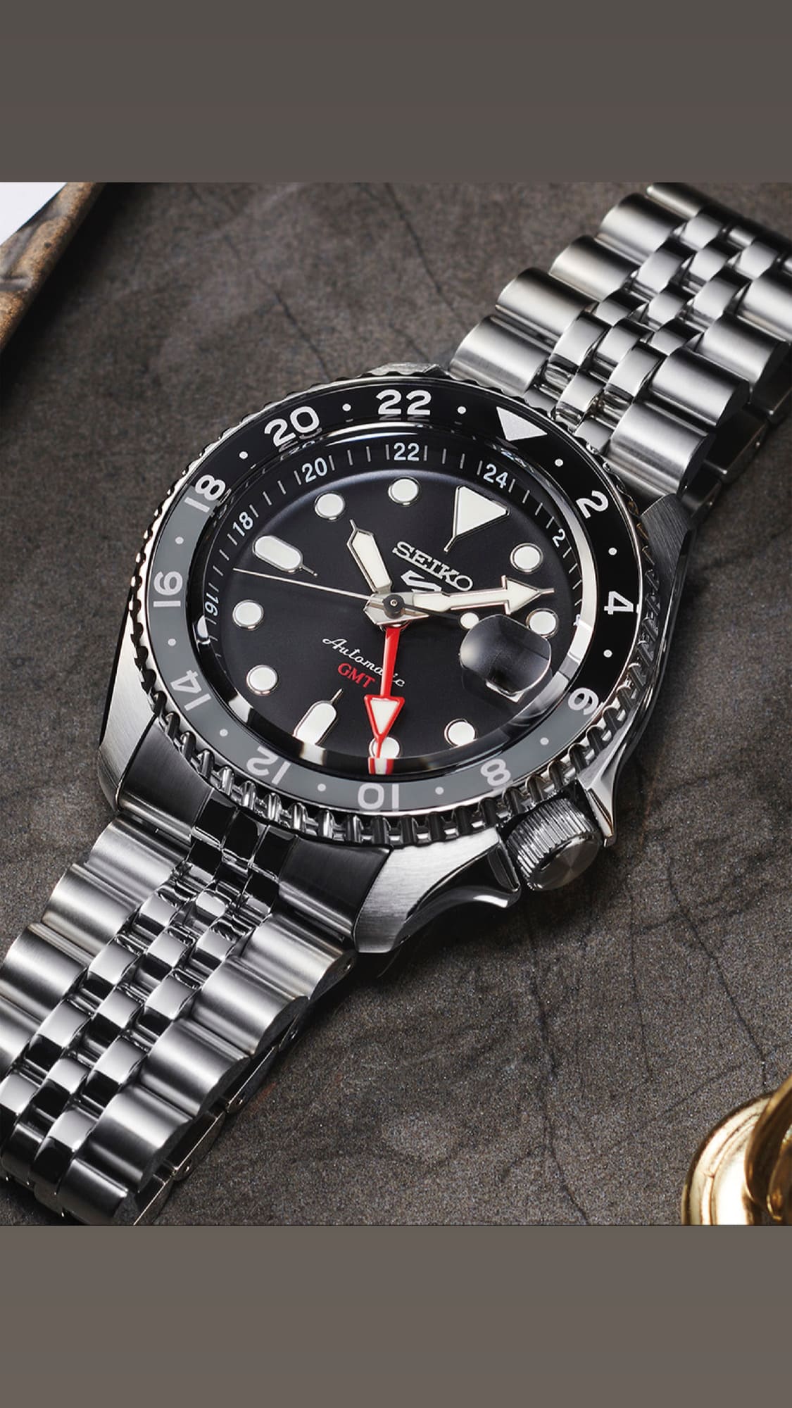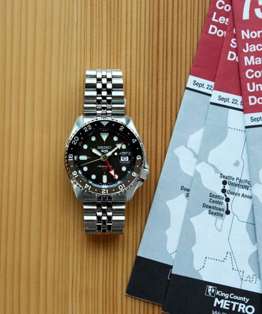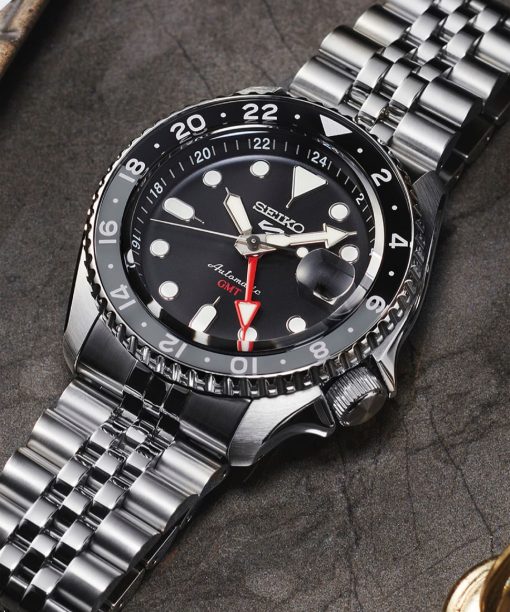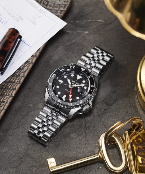 Seiko 5 Sports Style «SKX» DESIGN GMT. Den nye GMT modellen får du nå med nytt kaliber og med jubilee lenke som var veldig populær på SKX dykkerklokkene. Den nye serien har en kasse diameter på 42.50 mm og en tykkelse på totalt 13.49 mm. (+ 0.11 mm sammelignet med vanlig Seiko 5 ur).