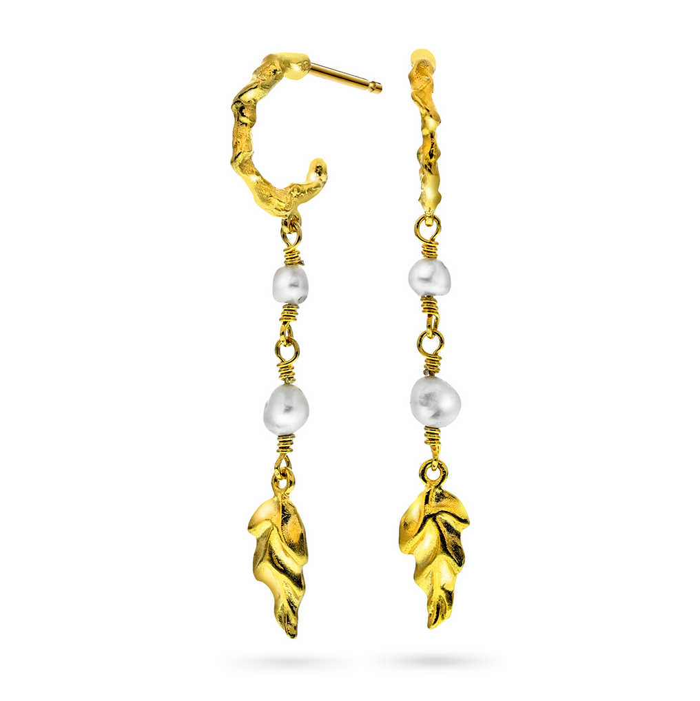Trendy øredobber med strukturert effekt, vakre keshi barokkperler og bladformet anheng.Lang modell. Finnes også i 2 kortere varianter. Sesongens musthave!