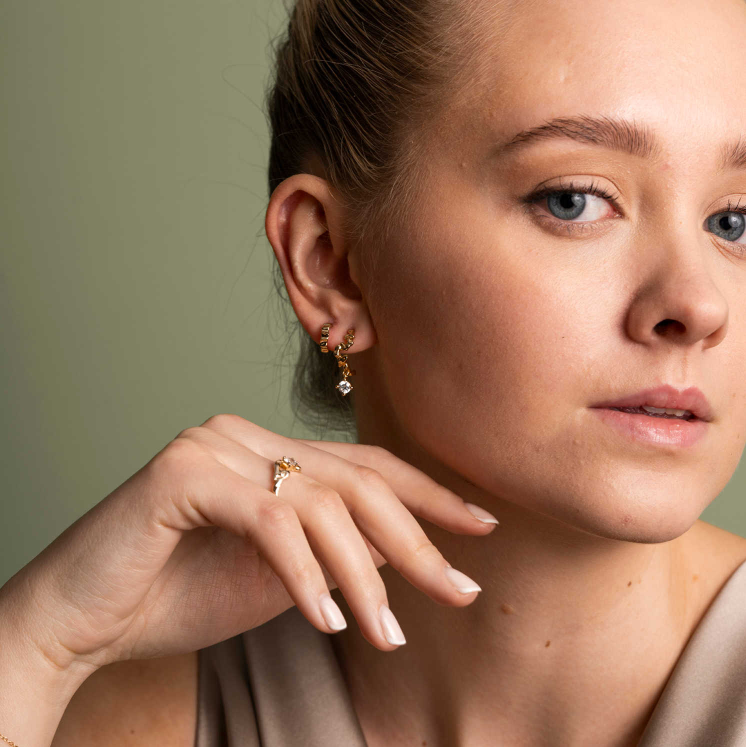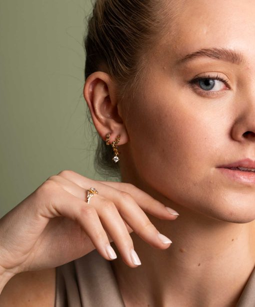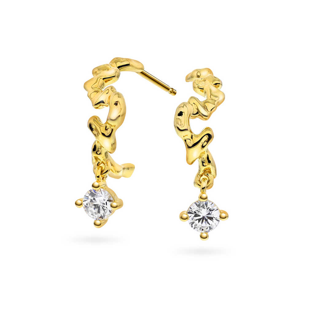 Nydelige øreringer med organisk form og skinnende zirkonia. Finnes også med blå opal, og i matchende ring.