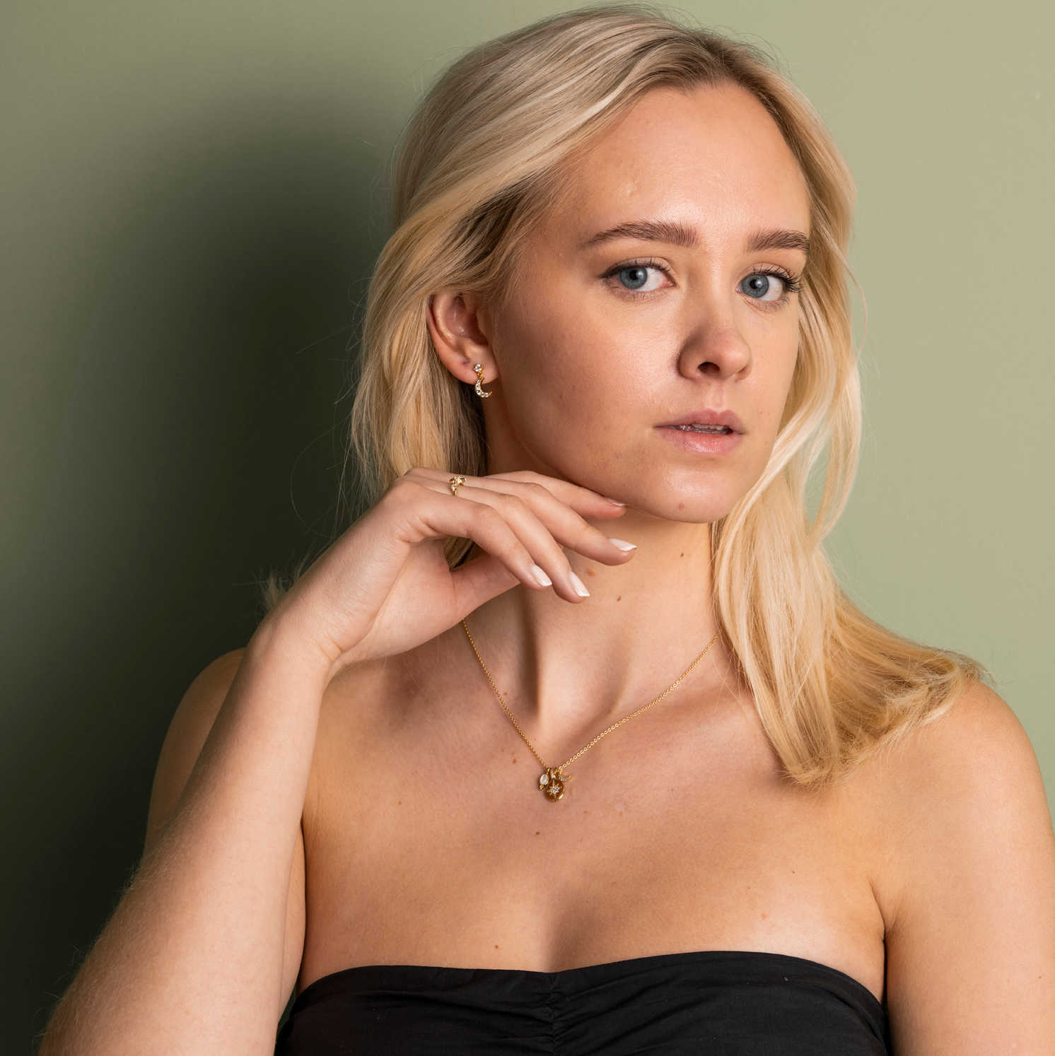 Trendy øredobber med ulike symboler, stjerne og måne. Knudrete overflater dekorert med blanke zirkonia. Finnes smykke og ring i samme serie og i rhodinert.