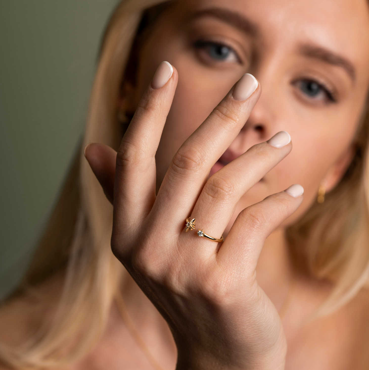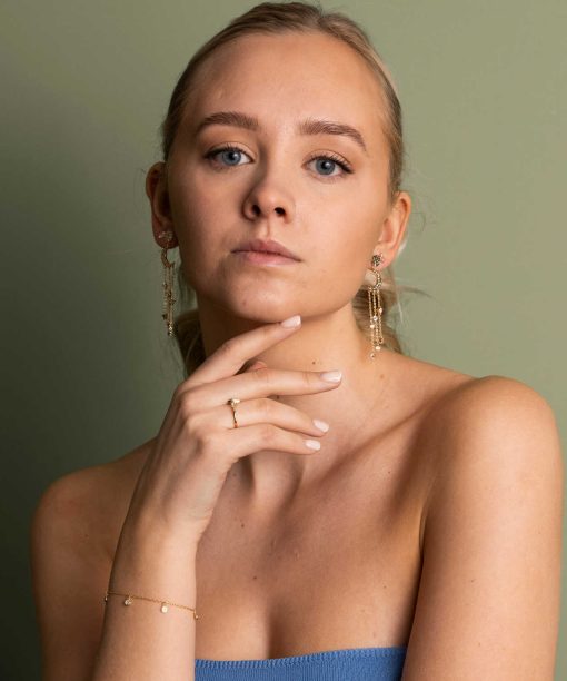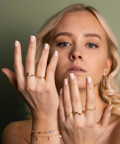 Justerbar modell som er åpen på toppen. Ringen kommer i 3 grunnstørrelser og kan justeres ca 2 størrelser opp og ned. Finnes i matchende smykke og øredobber og i rhodinert.