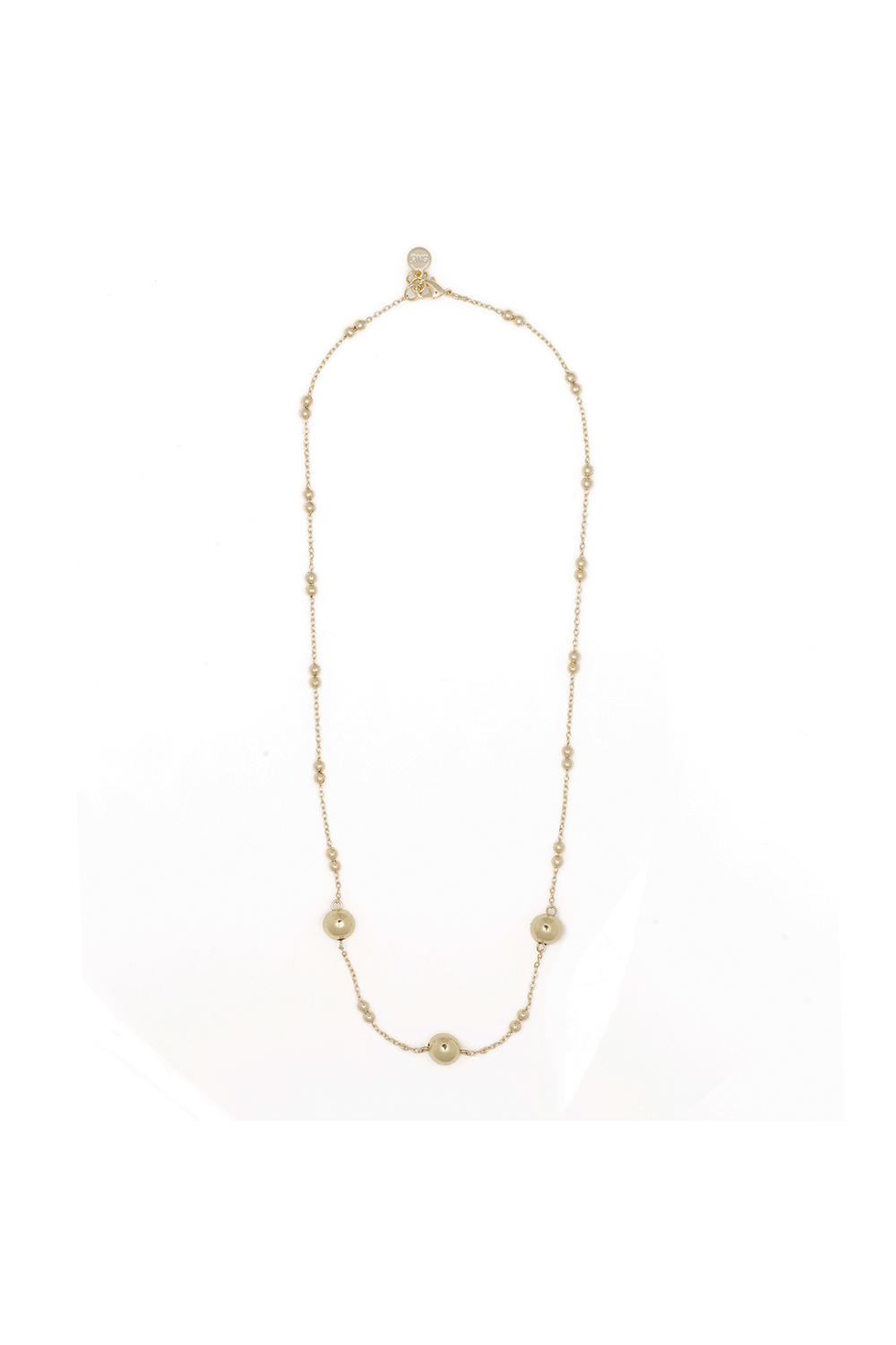 Necklace with metal beads in varying sizes, evenly spaced along a fine chain.