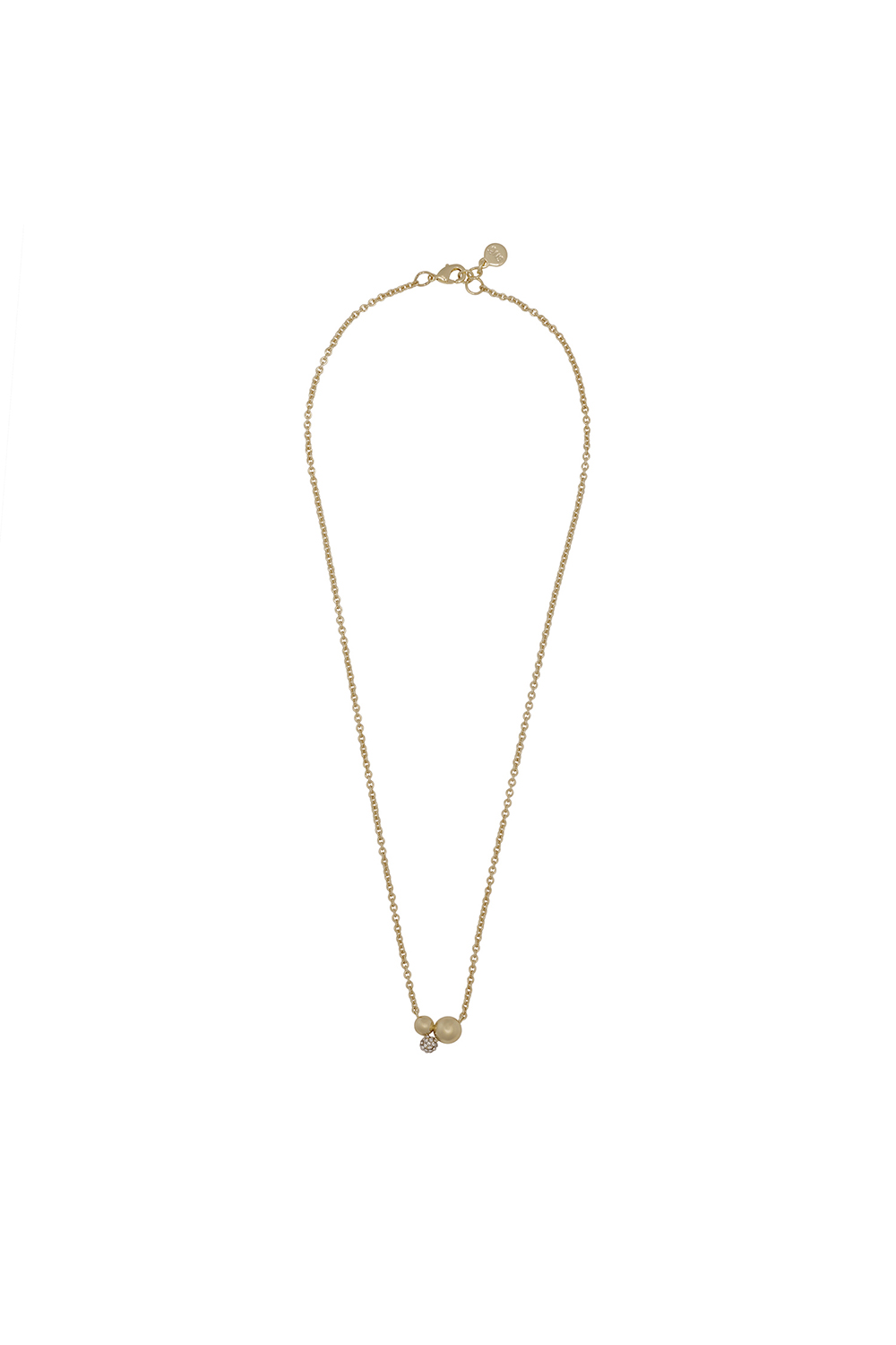 Fine chain necklace with three connected beads in varying sizes, one of which is adorned with small embedded sparkling stones.
