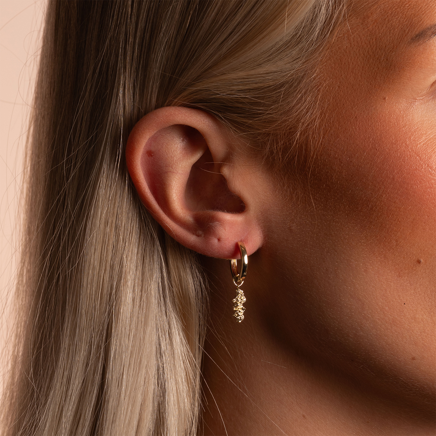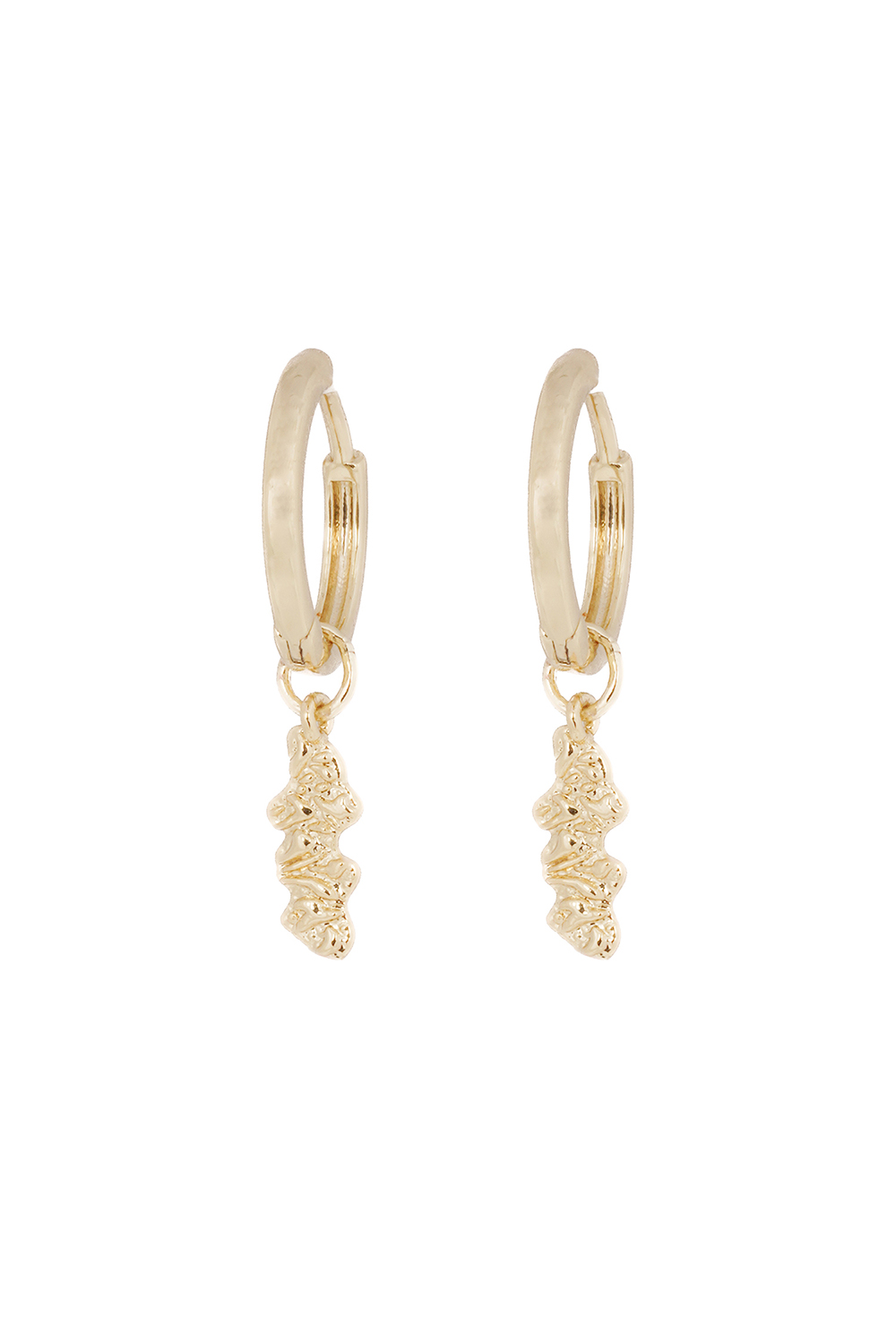 Thin gold-toned hoops with a sleek, elongated pendant. A subtle yet distinct piece that works well with both casual outfits and more dressed-up occasions.