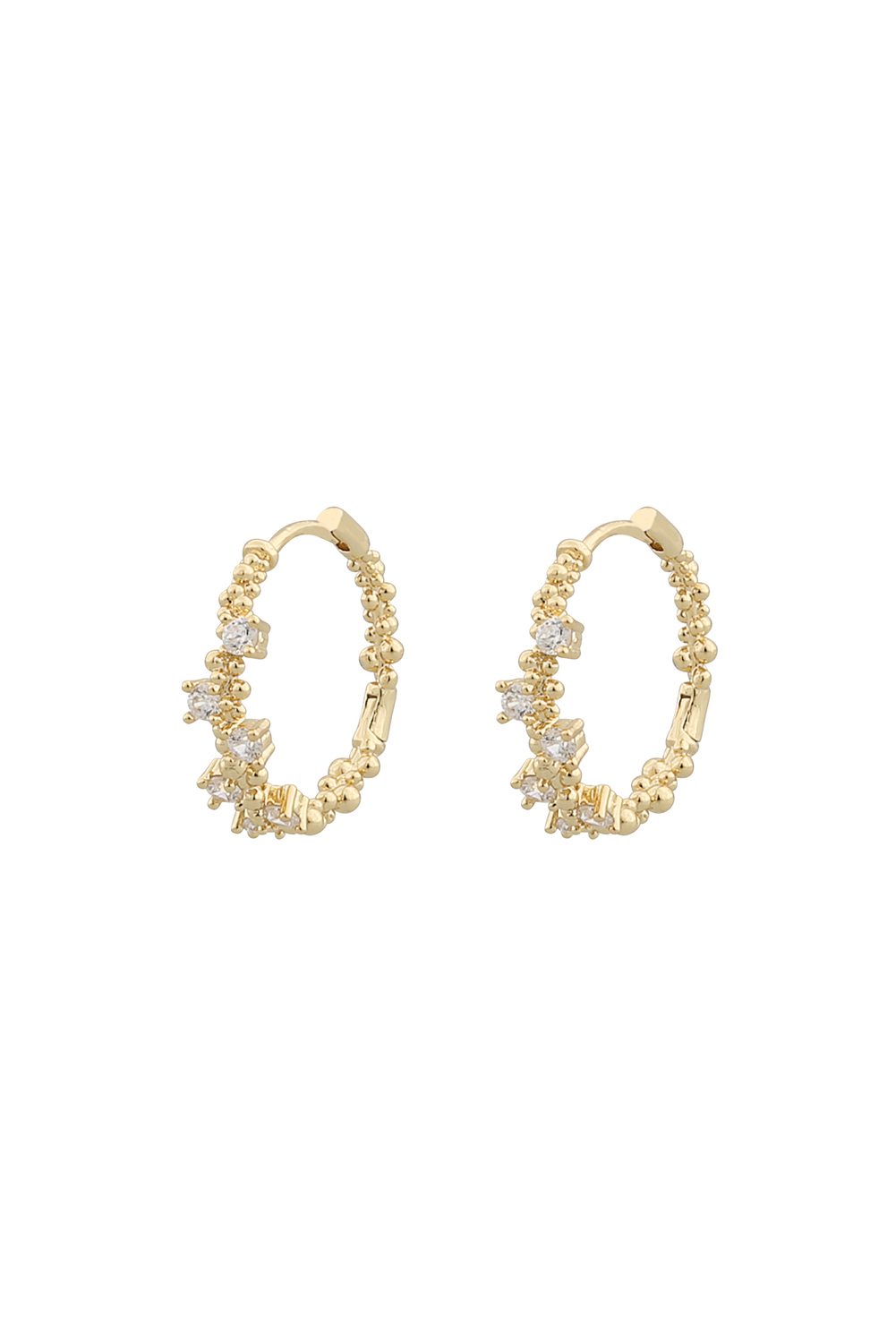 Cute pair of hoops with a unique design and cubic zirconia stones. These fashionable earrings are suitable for all occasions. Easy to use with click lock.