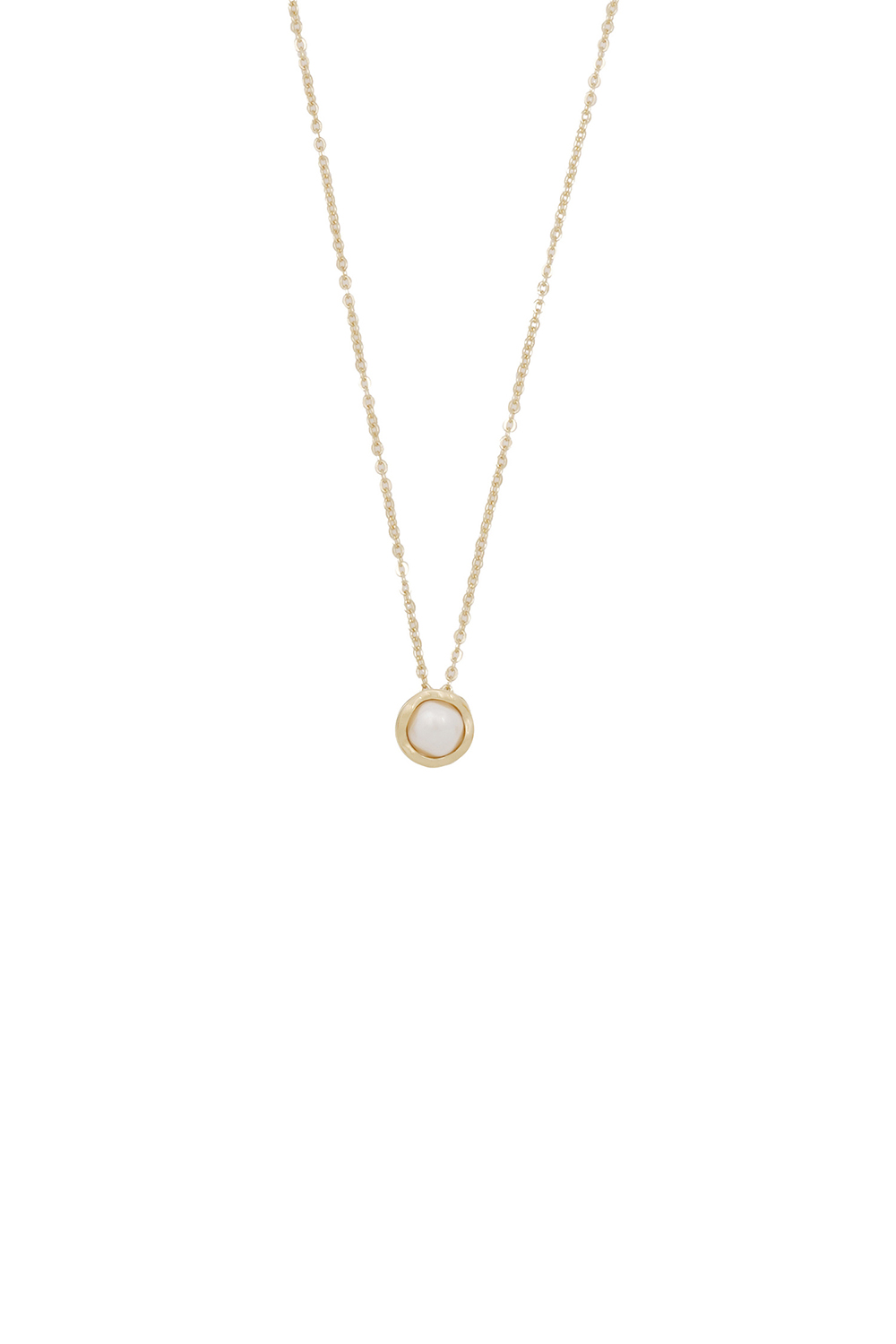 Necklace with a fine chain and a round pendant featuring a set pearl. The pendant’s slightly textured frame adds a subtle contrast to the smooth surface of the pearl.