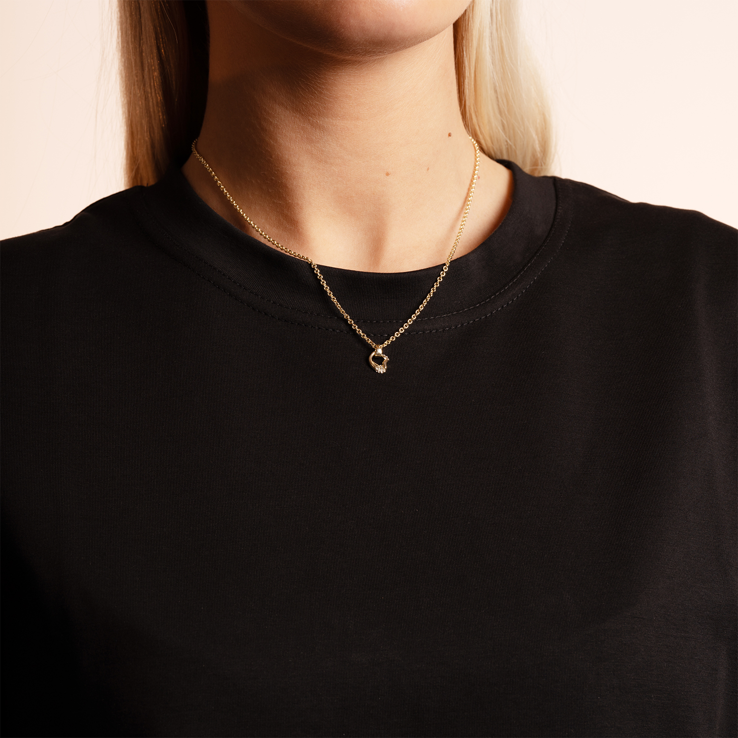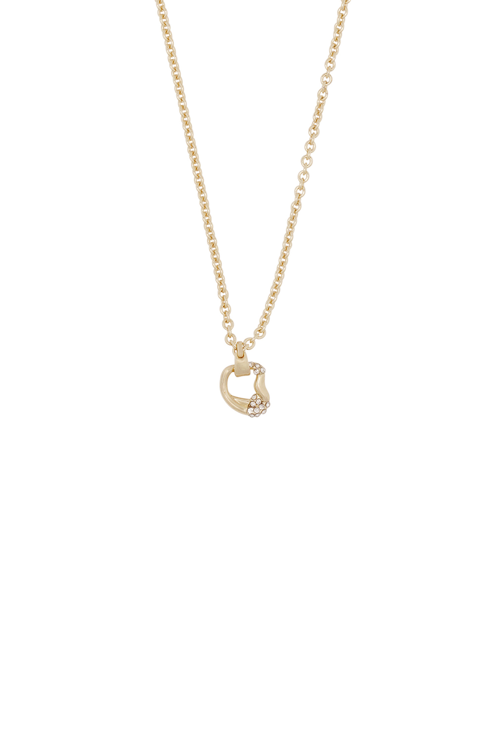 Necklace with a chain and a dangling charm featuring an open, rounded design, soft lines, and inset stones placed as subtle details.