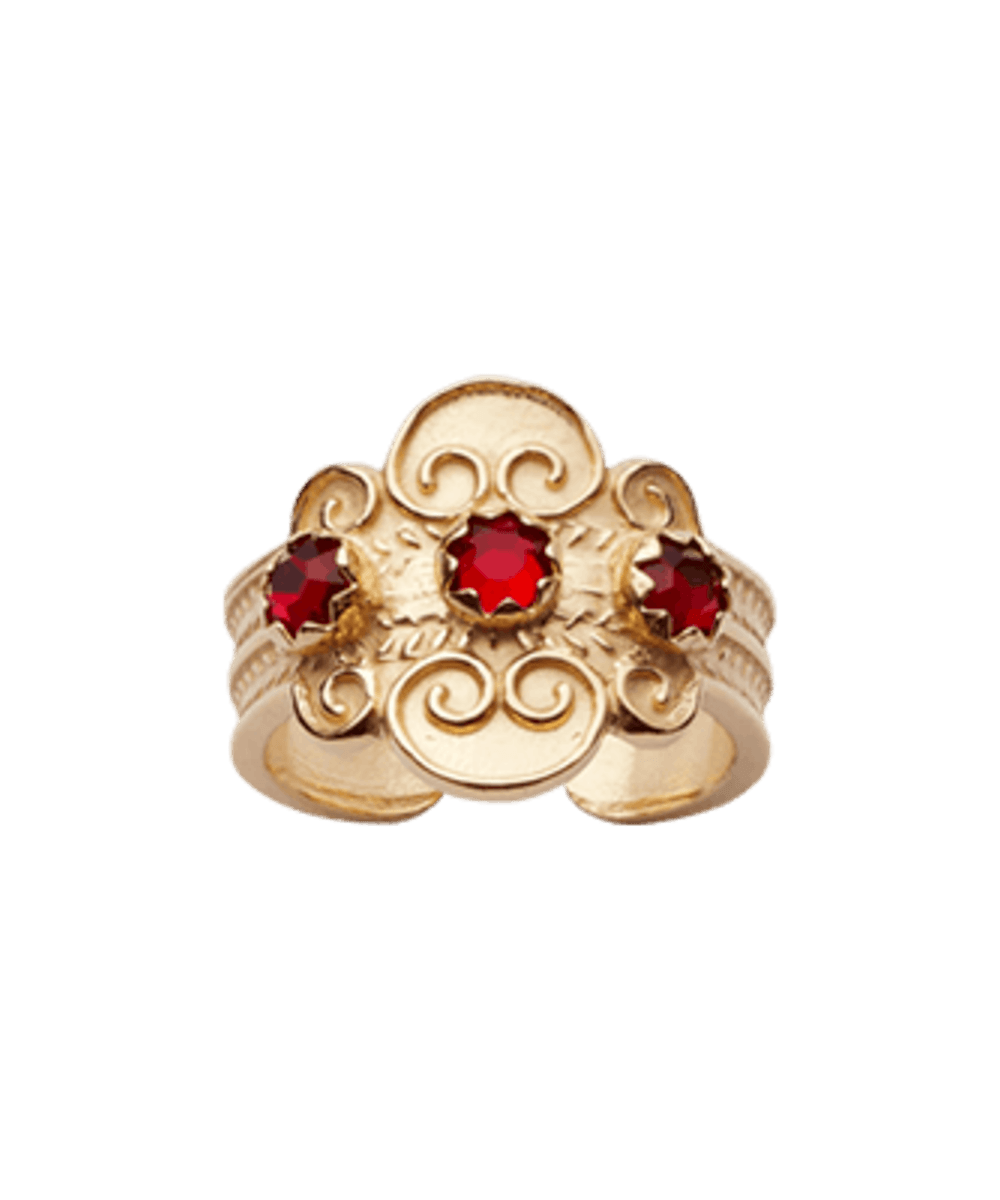 Bunadsring med raud stein, forgylt