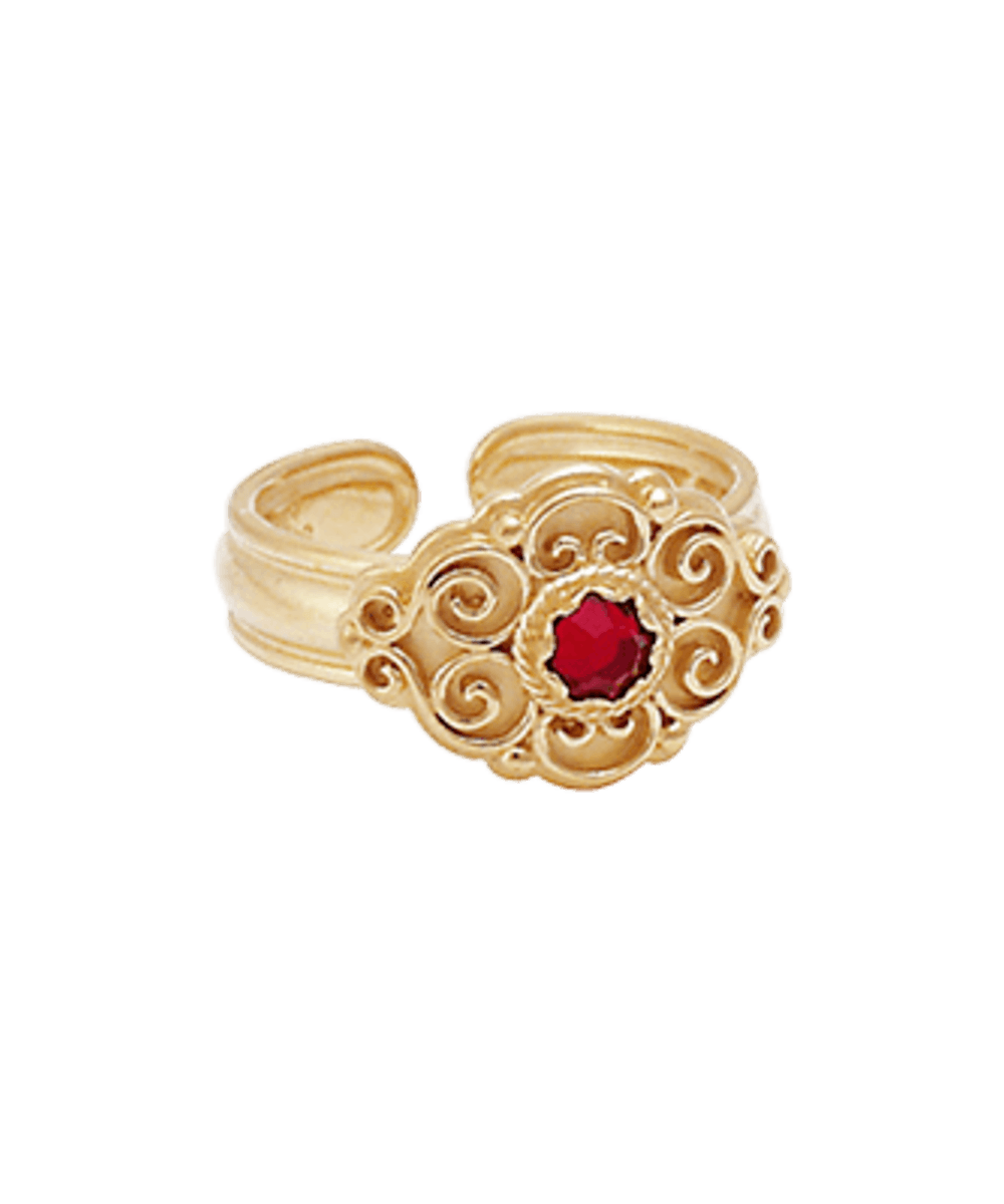 Bunadsring med raud stein, forgylt