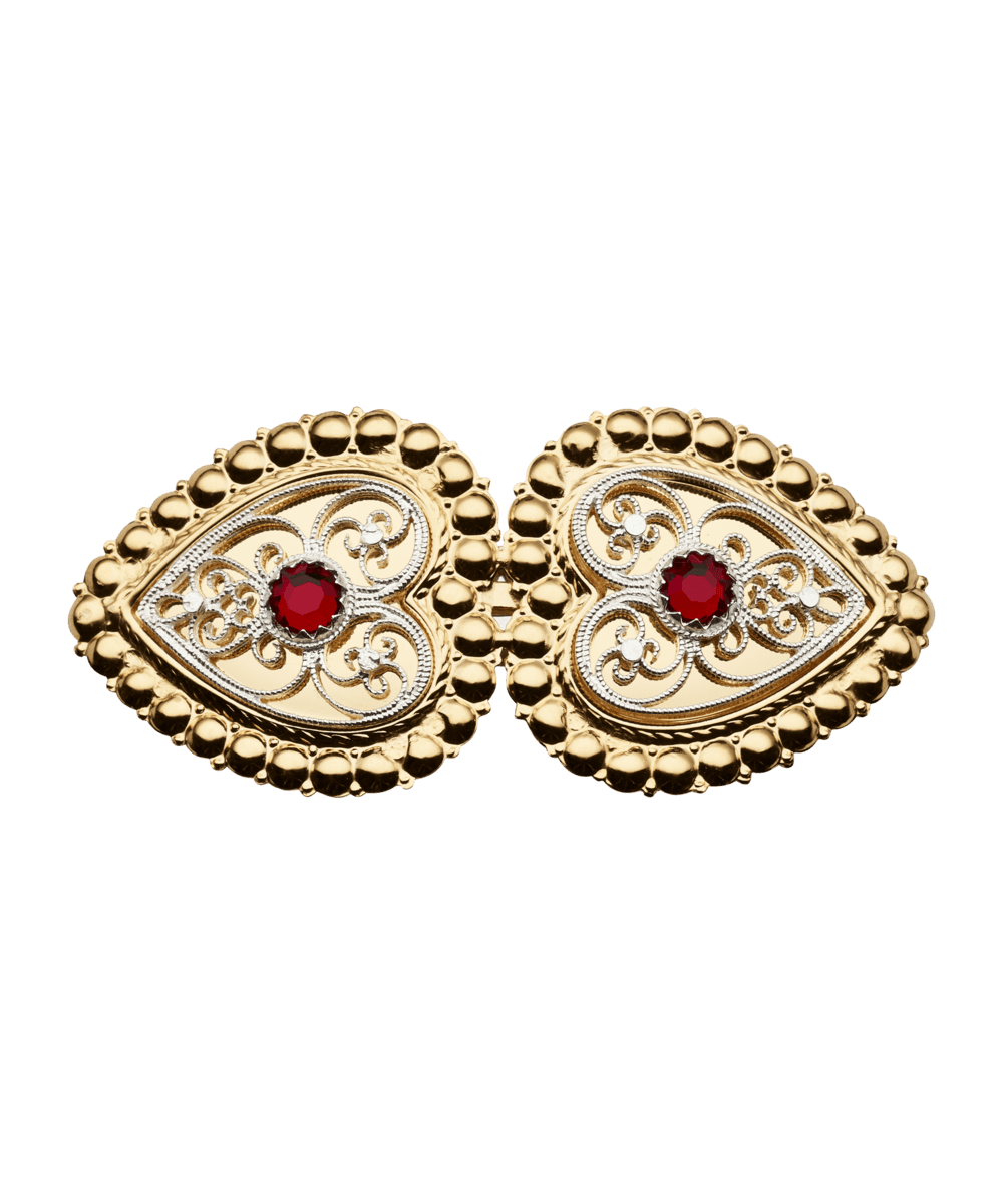Hårspenne med perlekant og raud stein, forgylt/kvit