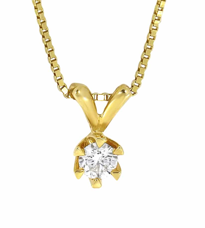 Victoria enstens diamantanheng i 585 hvitt eller gult gull. Et enkelt, vakkert og tidløst smykke. Diamanten er fattet med 6 klør og har en v-formet hempe som gjør at smykket ligger stødig og flott på halsen. Victoria enstens diamantsmykke fåes i mange ulike diamantstørrelser.