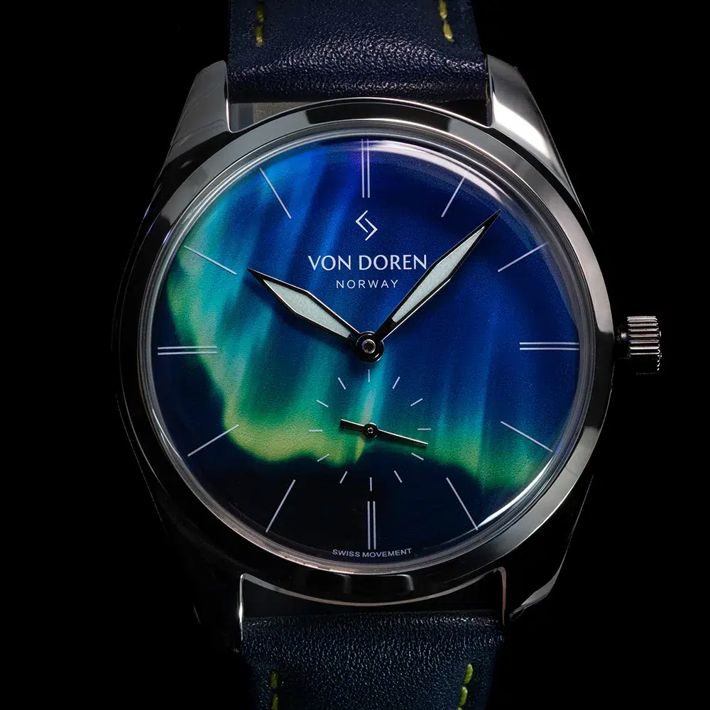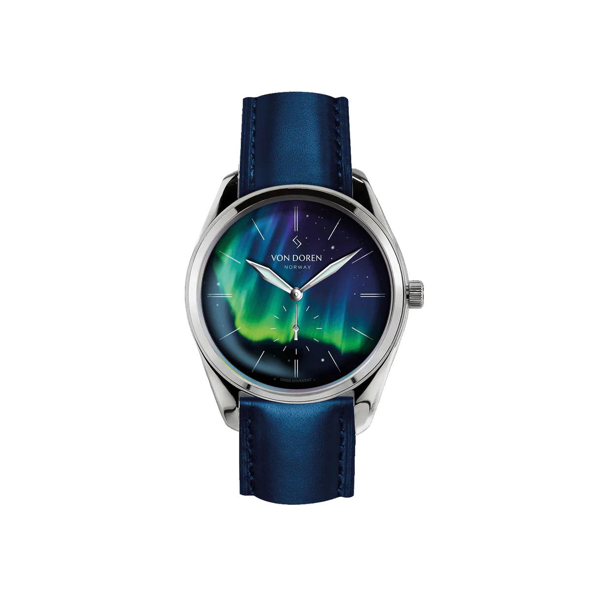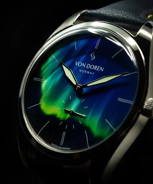 Inspirert av det spektakulære nordlyset fanger Runde Nordic Light essensen av Aurora Borealis i et elegant og tidløst design. Klokken kombinerer ren skandinavisk minimalisme med nøye utvalgte detaljer inspirert av nordlysets magiske fargespill. De små stjernene på skiven er belagt med lume og lyser diskret i mørket – en subtil påminnelse om lyset som aldri forsvinner. Nordlyset er naturens mest fascinerende lysshow. Bølger av grønt, fiolett og blått beveger seg over den nordiske himmelen og skaper øyeblikk av ren magi. Av og til viser det seg langt sør for polarsirkelen og minner oss om at ekte skjønnhet ofte dukker opp uventet – selv i de mørkeste nettene. Runde Nordic Light er en hyllest til dette øyeblikket.